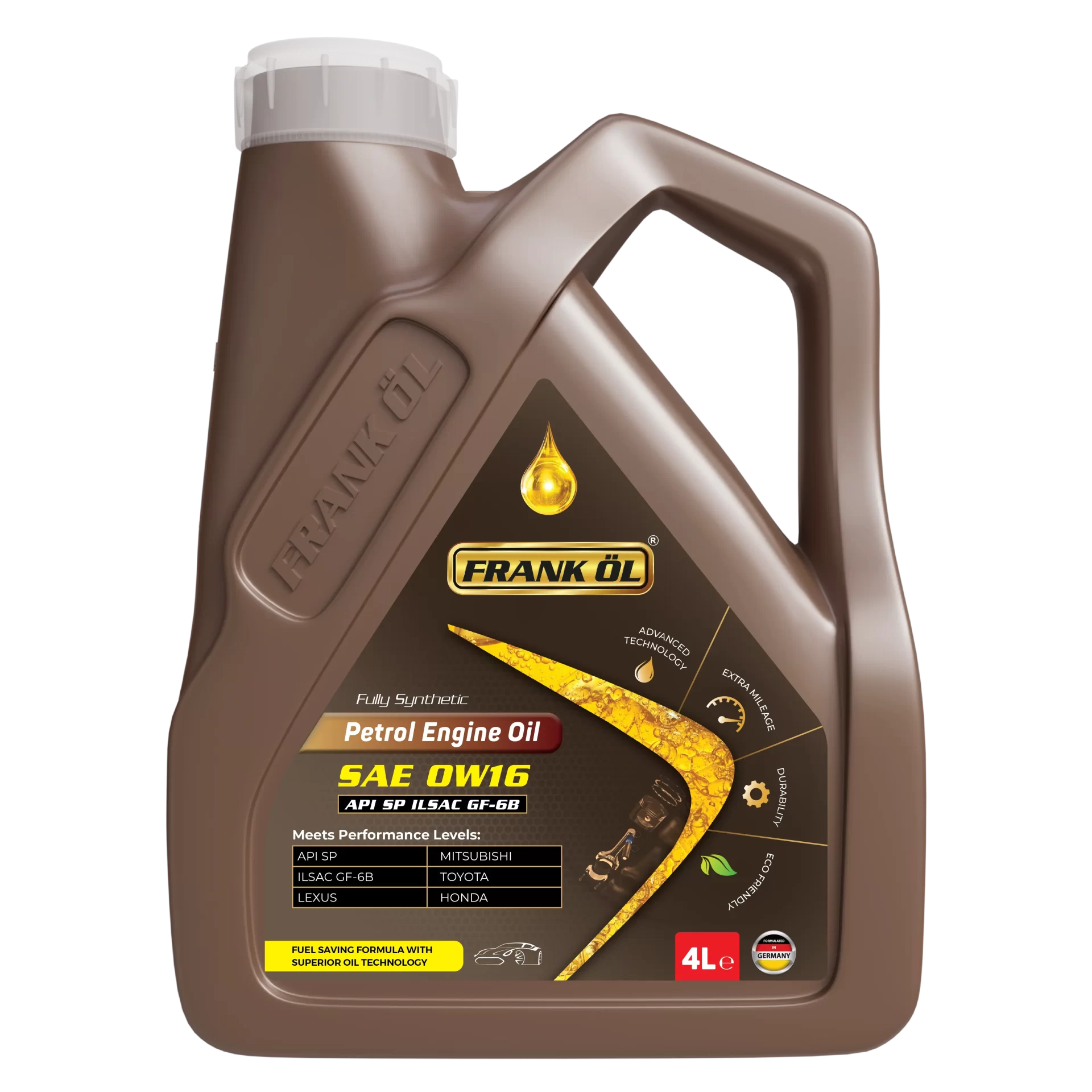 Frankol 0W-16 is a fully synthetic ultra low viscosity multi-grade engine oil formulated for use in passenger cars specifying the use of oil meeting API SP, ILSAC GF-6B requirements. These oils are engineered to provide the highest levels of engine protection available. These premium engine oils contain synthetic base oils and a technologically advanced additive system which provides improved oxidation resistance, improved deposit protection, better wear protection, excellent low temperature performance and enhanced fuel economy.
